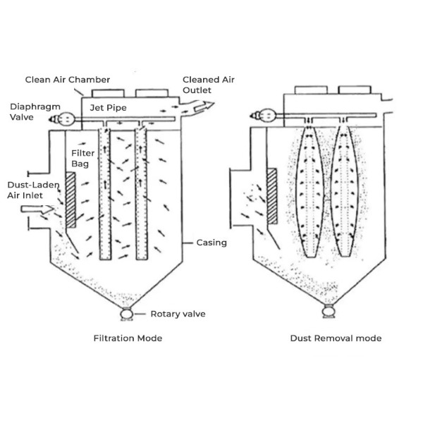 กลไกการทำความสะอาด: กลไก เช่น ระบบพัลส์เจ็ทหรือเครื่องเขย่าที่ใช้ในการทำความสะอาดถุงกรองเป็นระยะๆ เพื่อให้มั่นใจถึงประสิทธิภาพสูงสุด